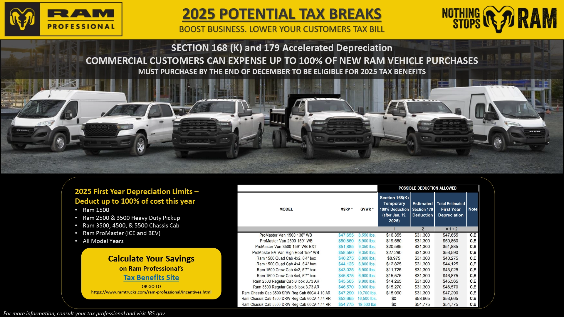 Business owners can save big with Section 168(k) and 179 tax deductions on new Ram Professional vehicles. Purchase by December 31, 2025 to qualify.